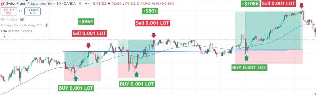 В этом сценарии бот использует скользящие средние, чтобы определить направление рынка, а затем делает сделки в самое подходящее время. Эта стратегия помогает получать прибыль и при этом снижать риски.